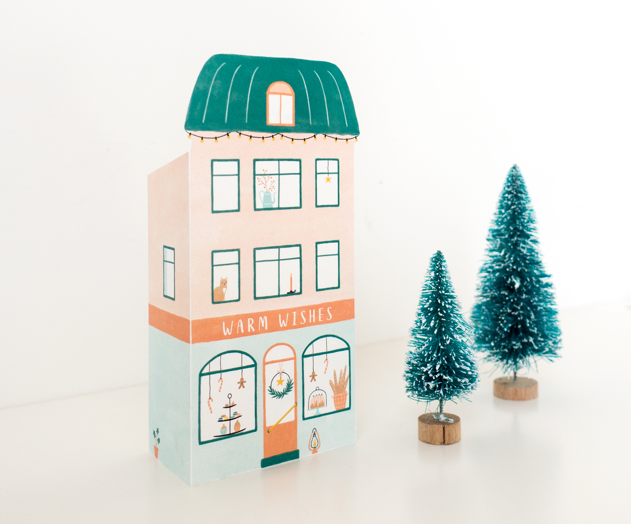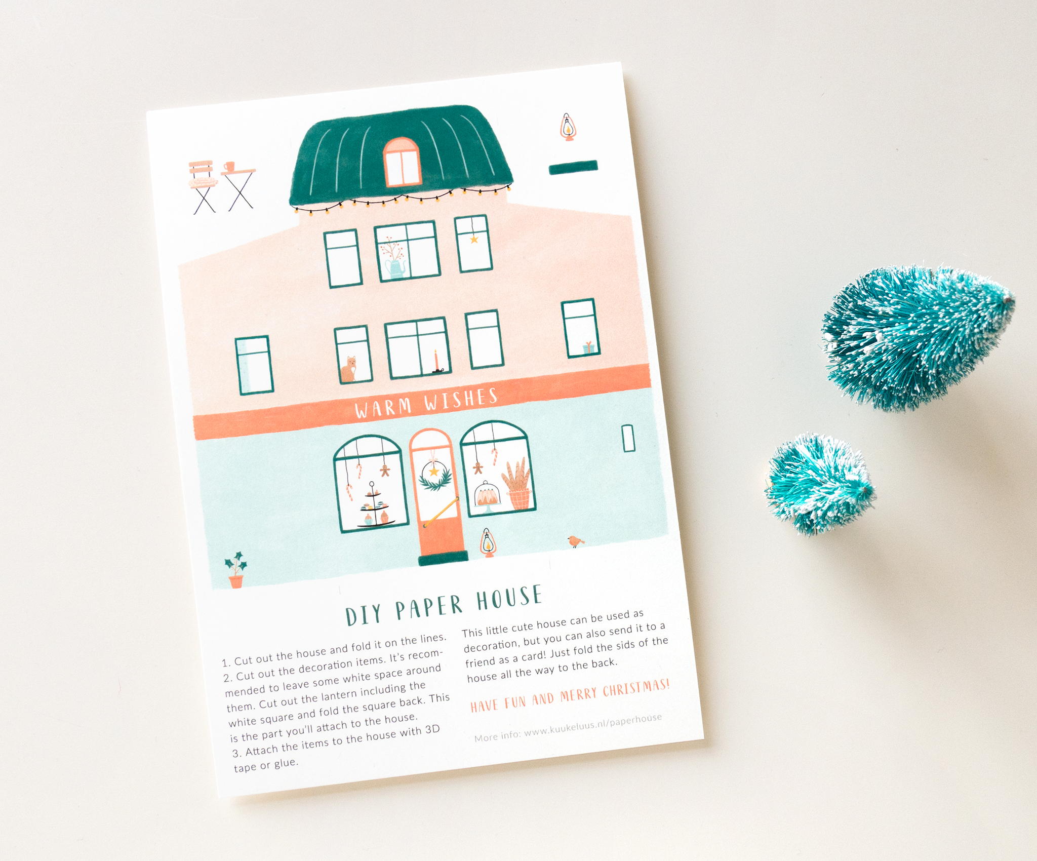 These cute little houses can be used as decoration, but you can also send them to your friends as cards! Just fold the sides of the house all the way to the back.