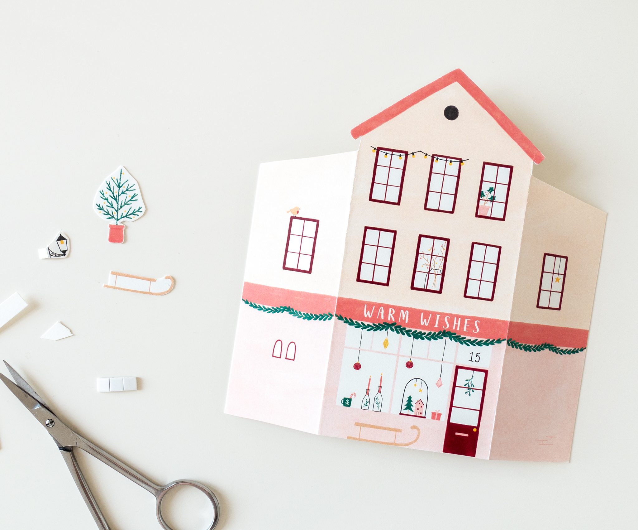 1. Cut out the house and fold it on the lines. The fold lines are cut in a bit so you can easily fold the paper.