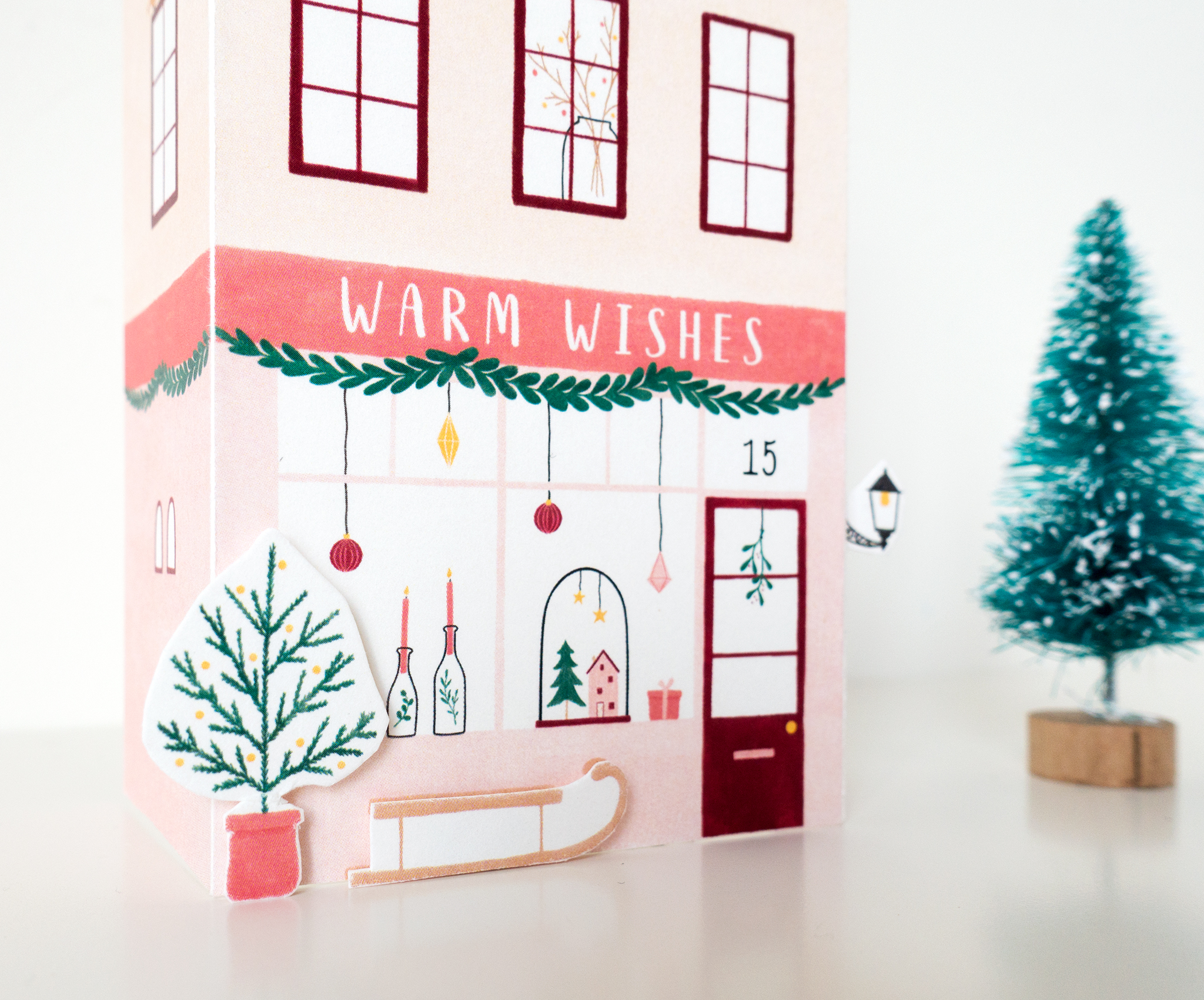 3. Attach the items to the house with 3D tape or glue. With 3D tape the items will come a little forward. Glue works better for the lantern on the side of the pink house.