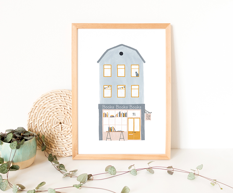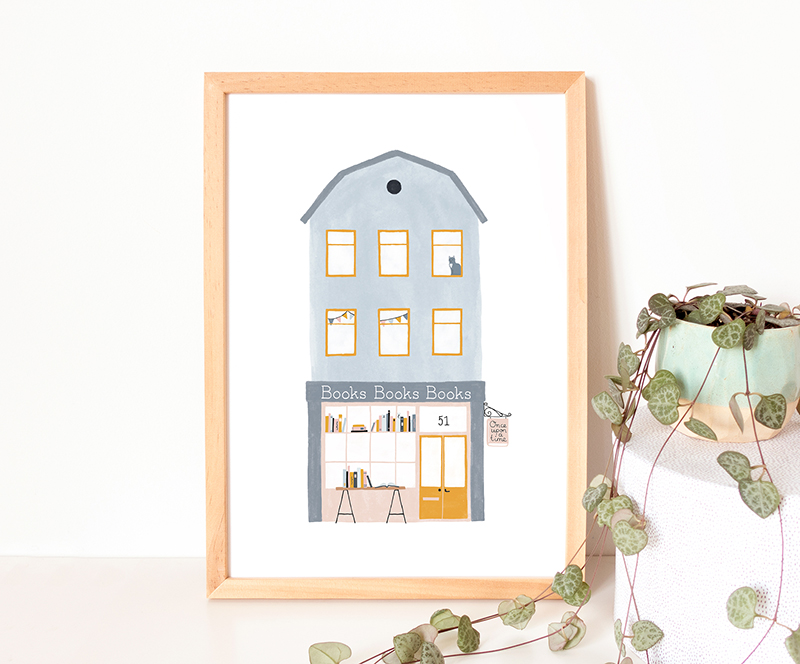 Met deze leuke poster van een boekenwinkel geef je een origineel cadeau aan een boekenliefhebber. Met mooie pasteltinten en leuke details.