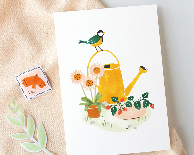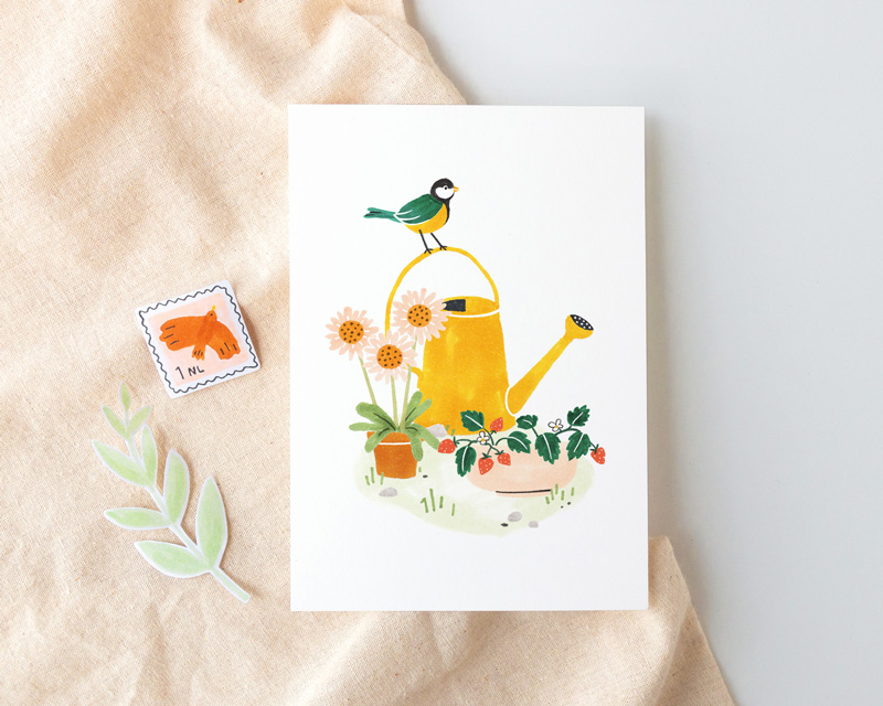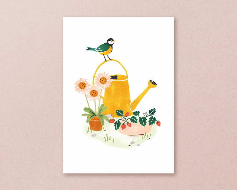 Bloeiende bloemen, rijpe aardbeien en een koolmeesje is net neergestreken op de gieter. Een heerlijk zonnig kaartje waar je geheid vrolijk van wordt.