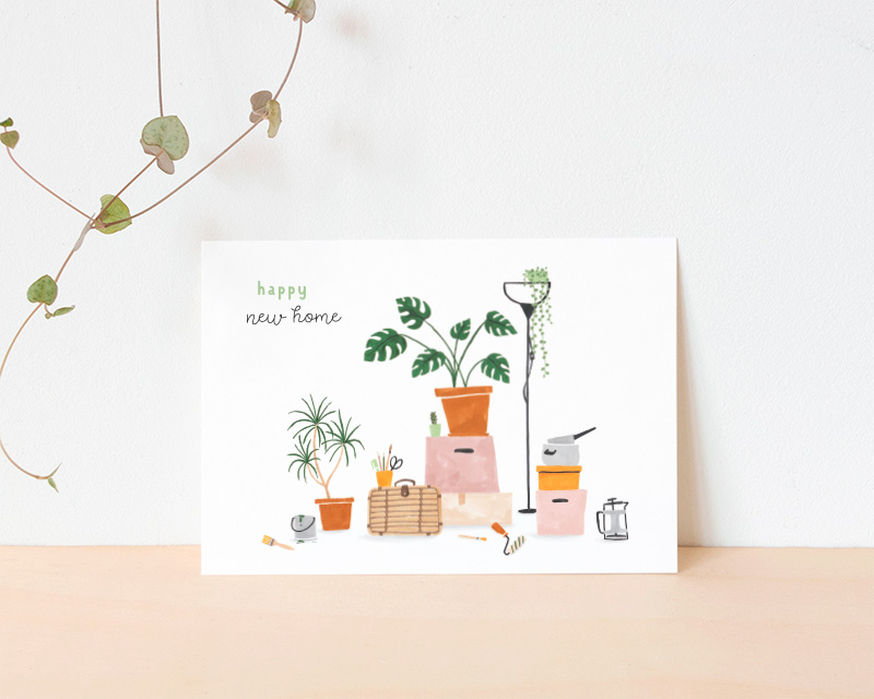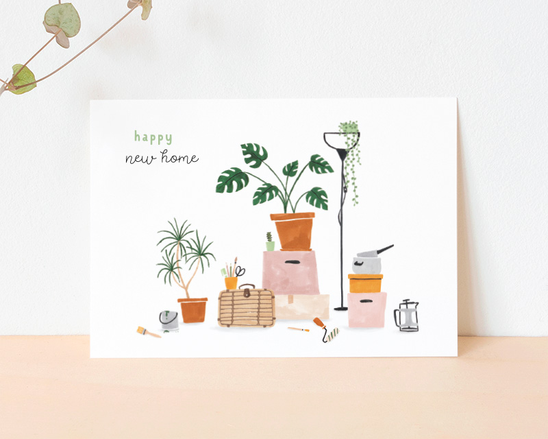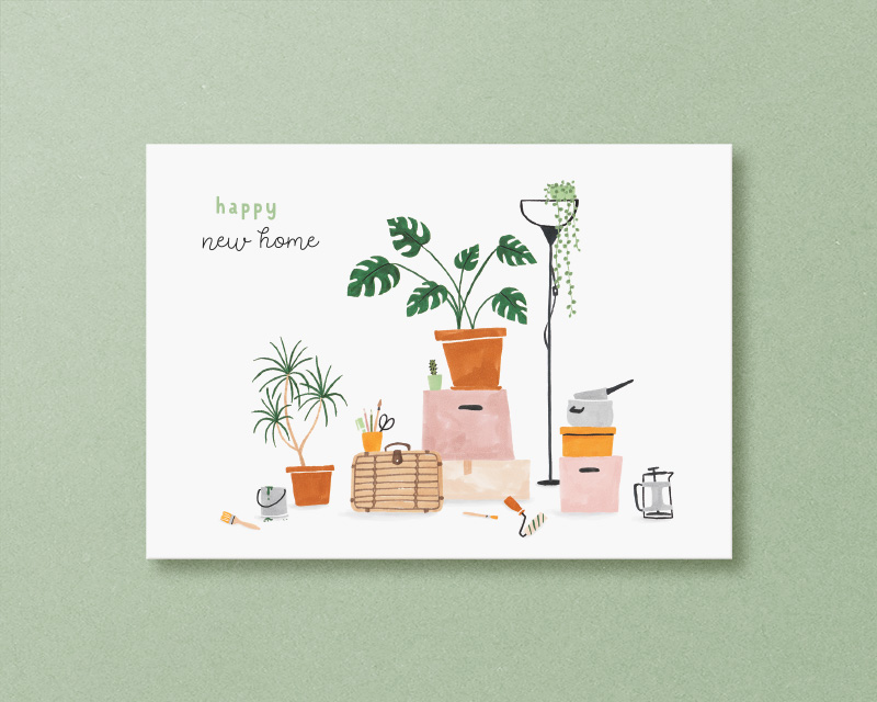 Wens vrienden veel geluk in hun nieuwe huis met deze leuke nieuwe woning kaart. Met dozen, verfspullen en planten → dus perfect voor die vriendin die een extra verhuiswagen nodig heeft voor alle plant babies. Ontzettend leuk om zo’n kaartje te krijgen en het fleurt het lege huis meteen op.