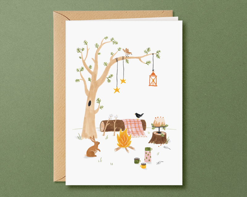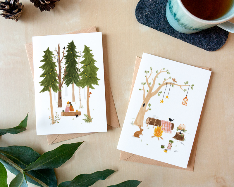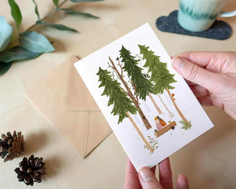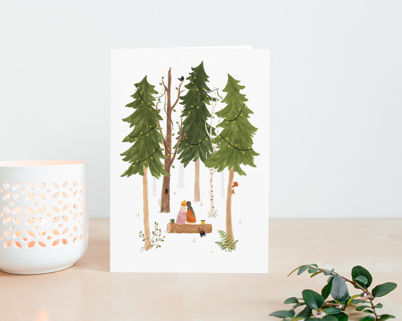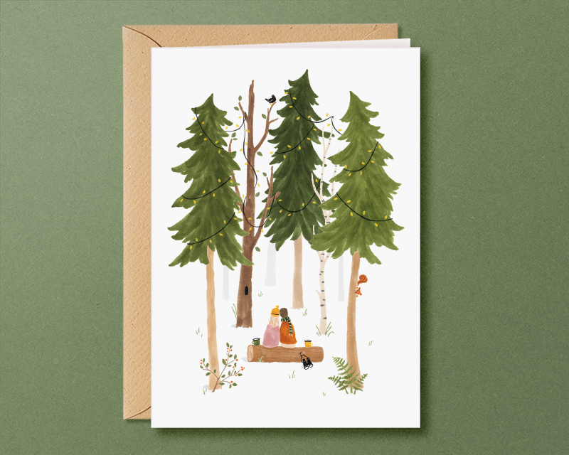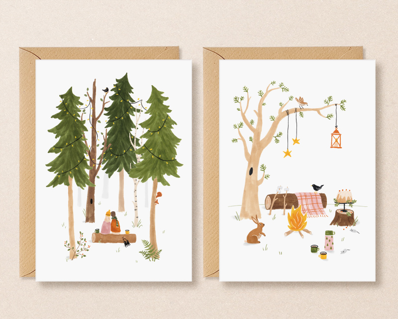 Verstuur de beste wensen met deze hartverwarmende winterkaarten. Ik heb de illustraties met liefde getekend, denkend aan wat ik zou willen met de feestdagen. Eventjes de drukte achter me laten en een rustig bos in. Samenzijn met mijn vriend, de bomen en de vogels.