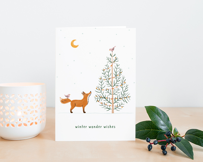 Verstuur je kerstwensen met deze lieve kerstkaart van een vos en vogeltjes in het bos. De kaart is getekend met fijne details en zachte kleuren, perfect voor je liefste vrienden.