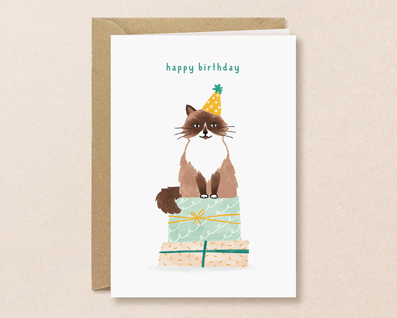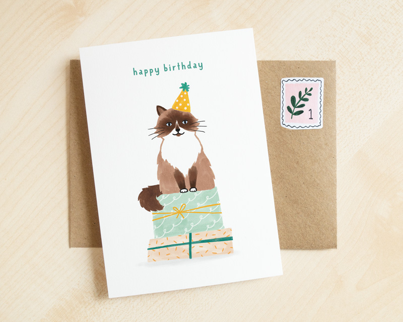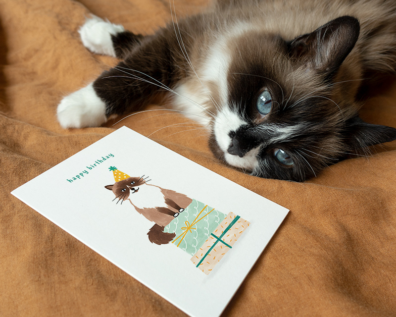 Op deze vrolijke verjaardagskaart tekende ik mijn eigen kat en geloof me: met Yuki is het altijd feest!