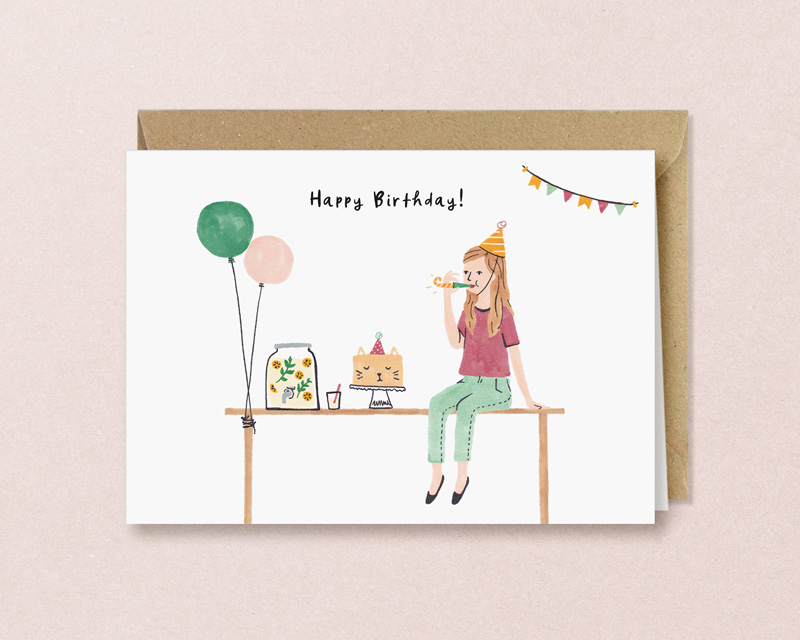 De perfecte kaart voor de jarige jet die van taart, katten en feestjes houdt.