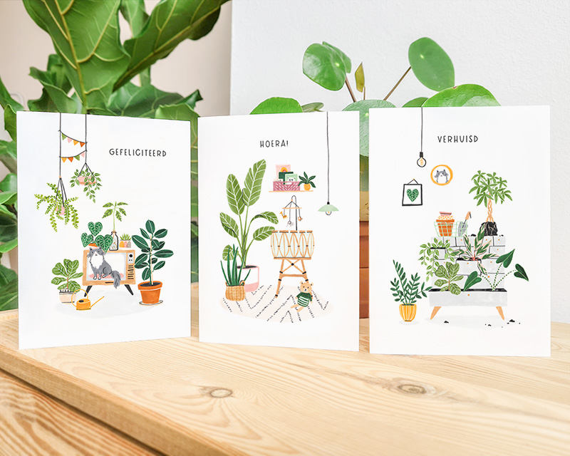 Een kat in een oude tv, een kast waar planten uit de laatjes groeien.. Je kent vast vrienden die daar blij van worden. En dat lieve babykaartje is altijd goed!